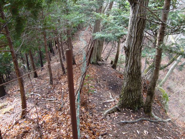 尾根に設置されたネット沿いに進んだところ、道が途切れており、30m程後退した。